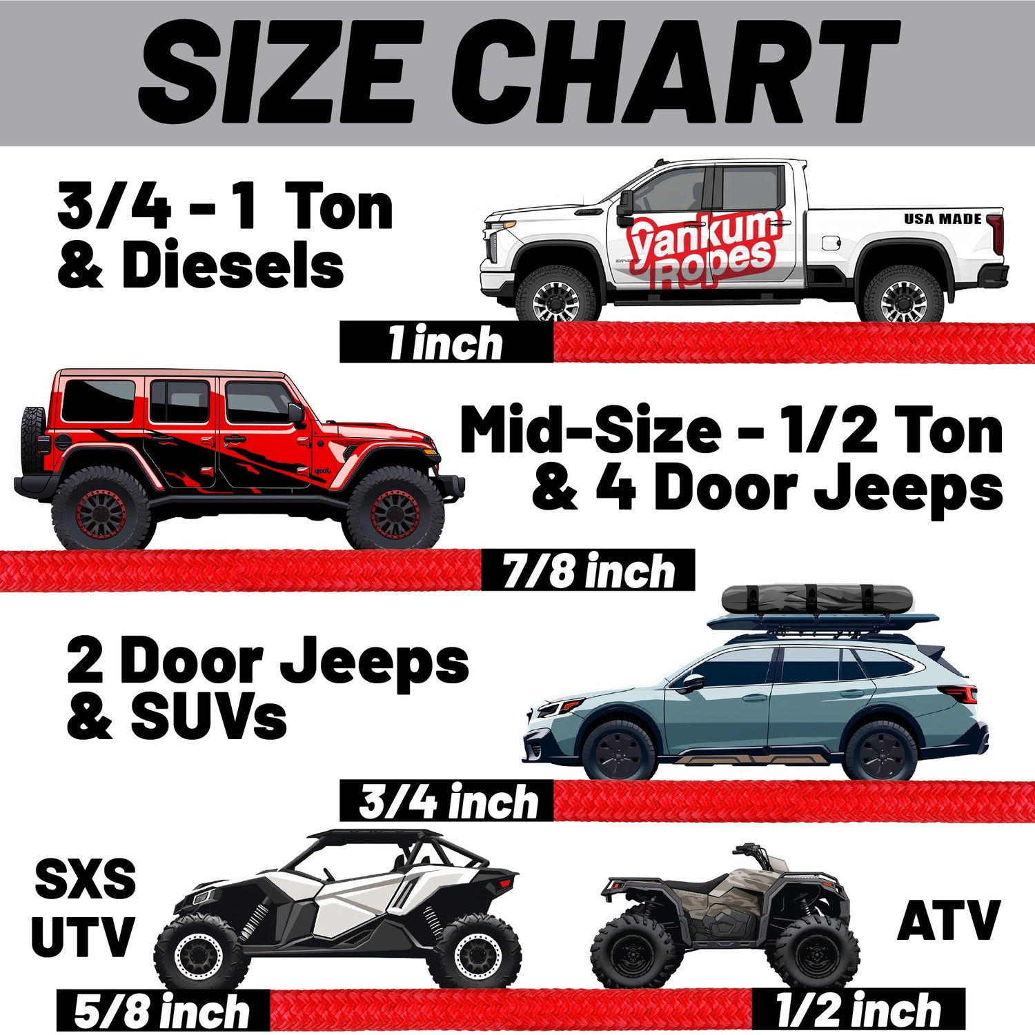 Stuck? This diameter size is best utilized in anything from Jeeps to 1/2 ton pickup trucks to large SUV's. It’s built to stretch and perform. This is the diameter rope used by Matt of Matt's Off Road Recovery for the banana and can be seen in use throughout all of Youtube.